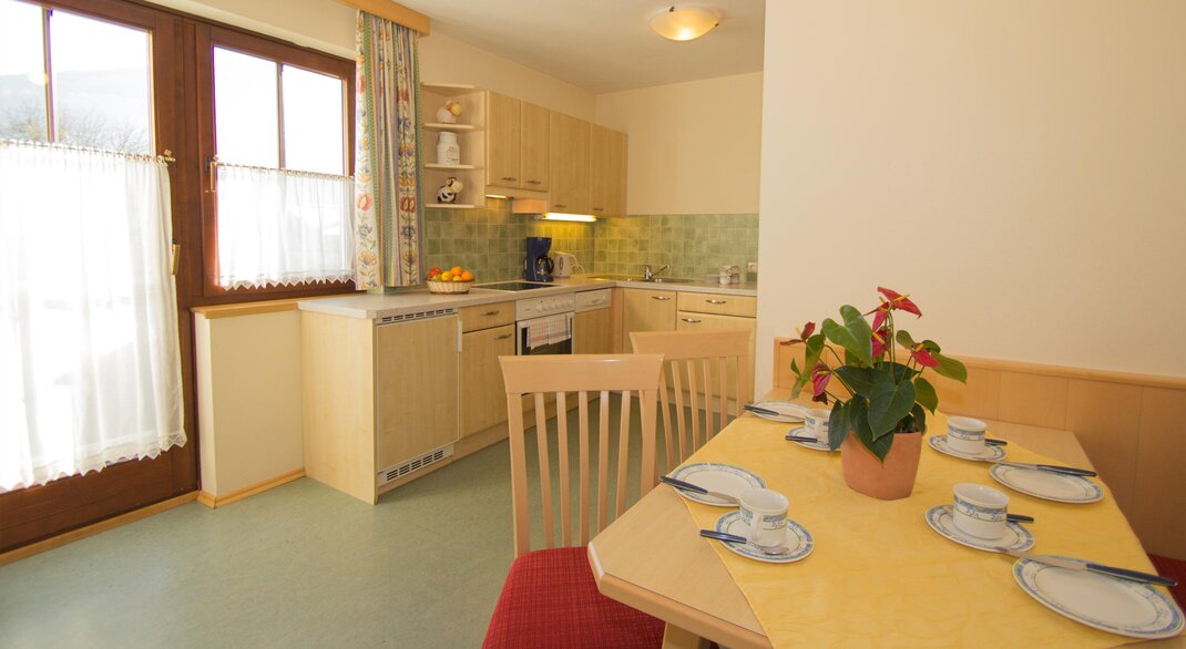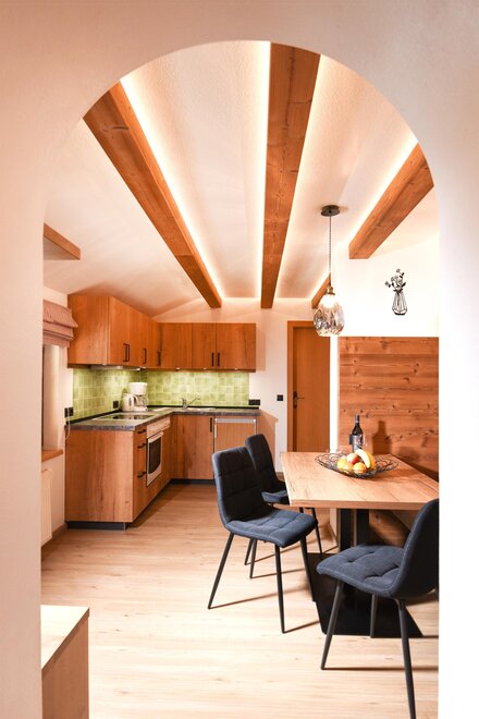 Die Feriewohnung Reiteralm ist im Erdgeschoß, eine Wohnküche mit Sofaecke.