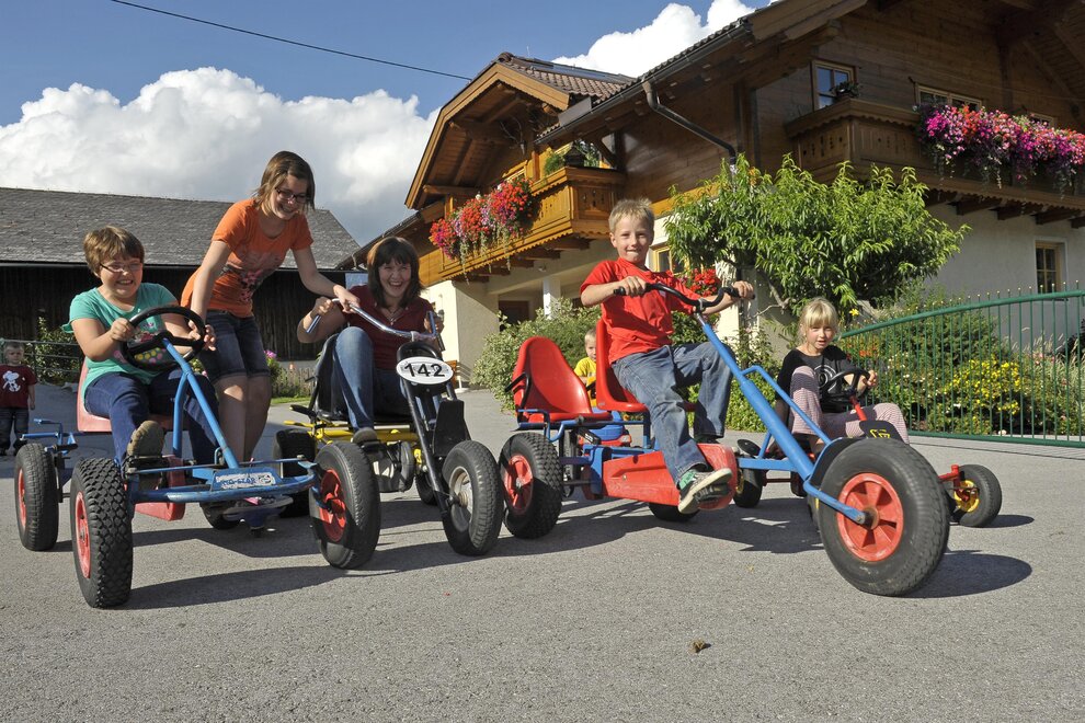 Auf unserem Hof dürfen Kinder noch Kinder sein. Ein riesengroßer Spielplatz, Gokarts und vieles mehr bieten viel Action.