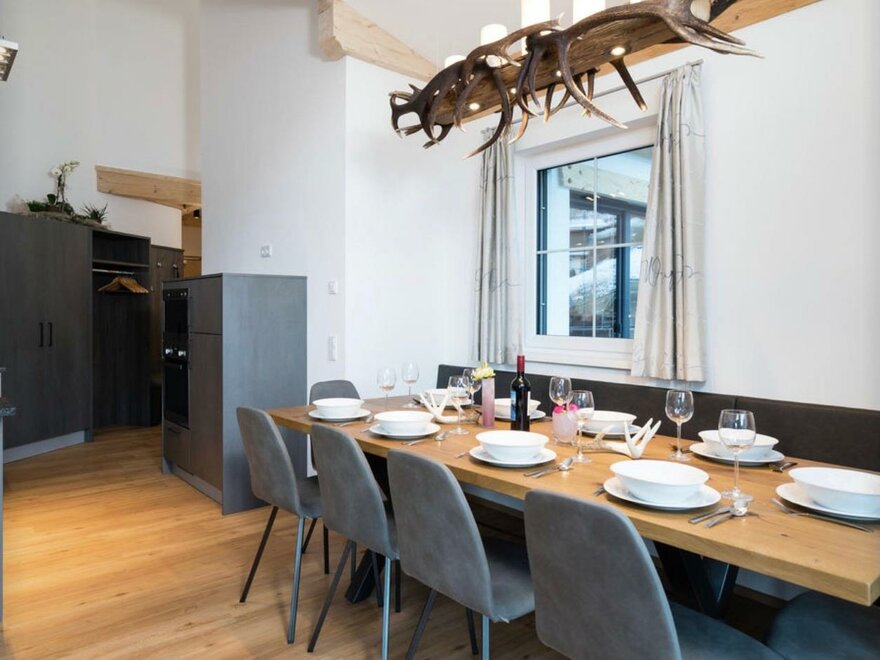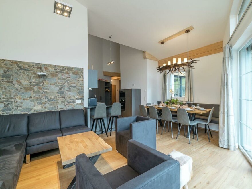 Der großzügige Wohn- und Essbereich lässt keine Wünsche übrig, Sitz- und Relaxmöglichkeiten für 10 Personen mit großen Panoramafenstern mit Blick auf den Heukareck.