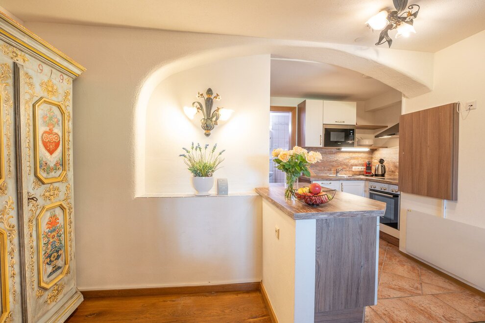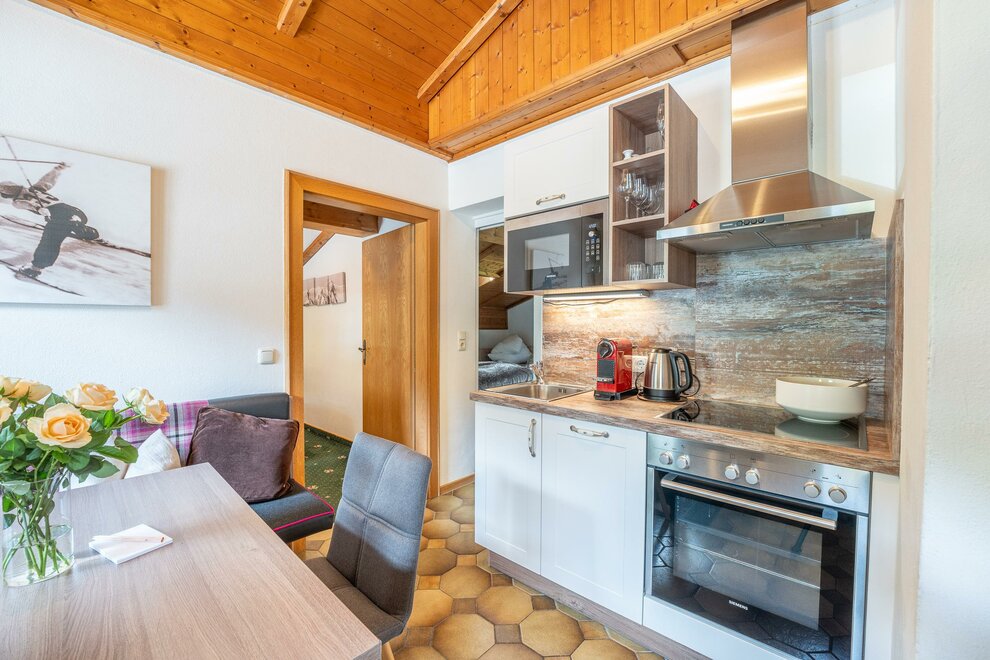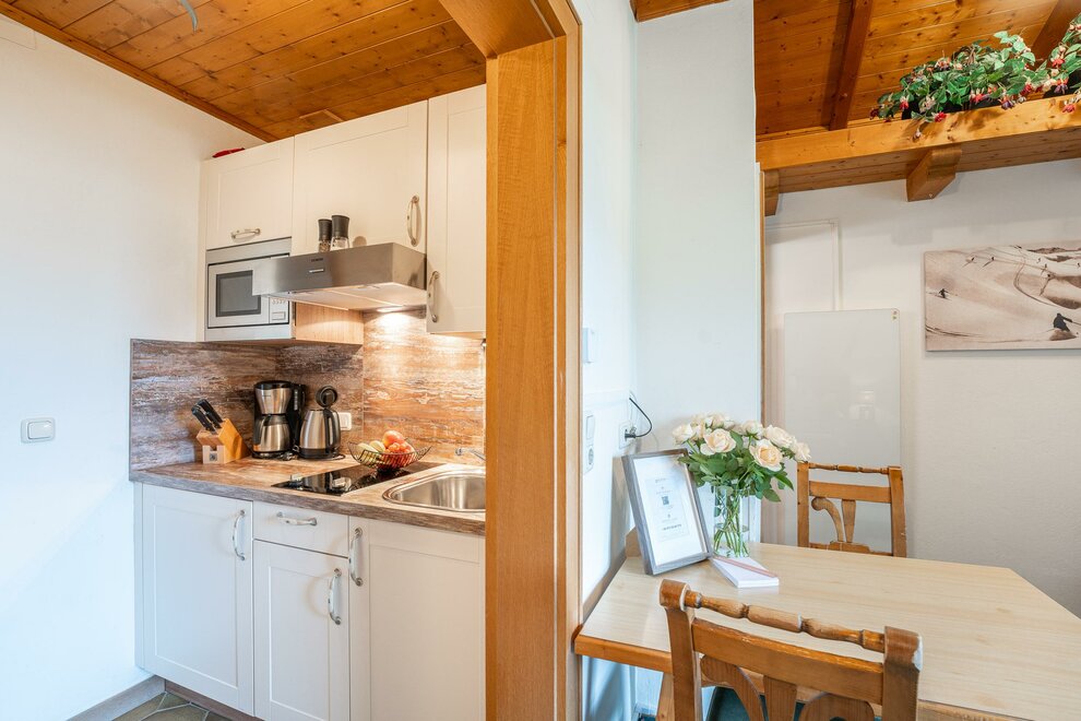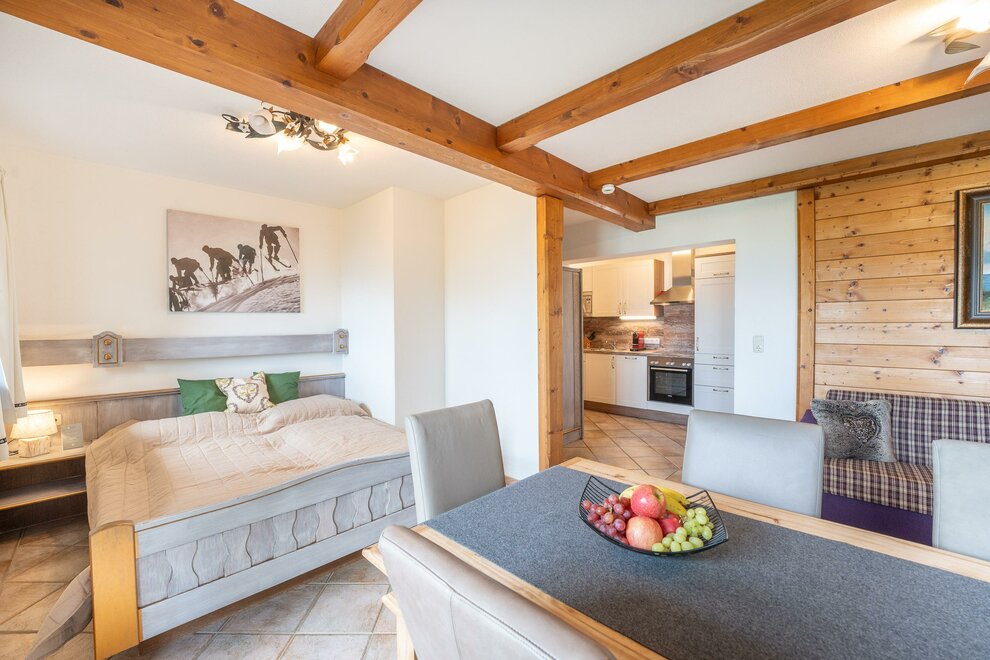 Das Apartment im Dachgeschoss verfügt über einen Wohn-Schlafraum mit einem Doppelbett und eine zusätzliche Person findet auf dem Sofa seinen Schlafplatz. Es stehen eine vollausgestattete Küchenzeile und ein Bad mit Dusche und WC zur Verfügung.