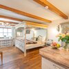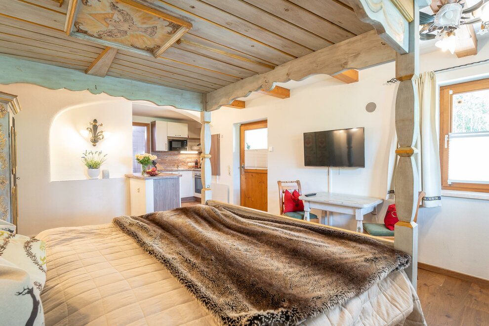 Das Apartment im Gartengeschoss verfügt über einen Wohn-Schlafraum mit einem Himmelbett und eine zusätzliche Person findet auf dem Sofa seinen Schlafplatz. Es stehen eine vollausgestattete Küchenzeile und ein Bad mit Dusche und WC zur Verfügung.