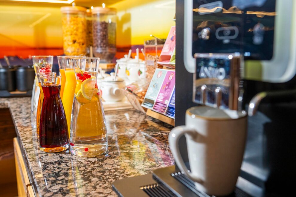 gestärkt mit der im Zimmer vorhandenen Cafe-Espresso Maschine mit Tabs, dem Wasserkocher und dem Minikühlschrank.