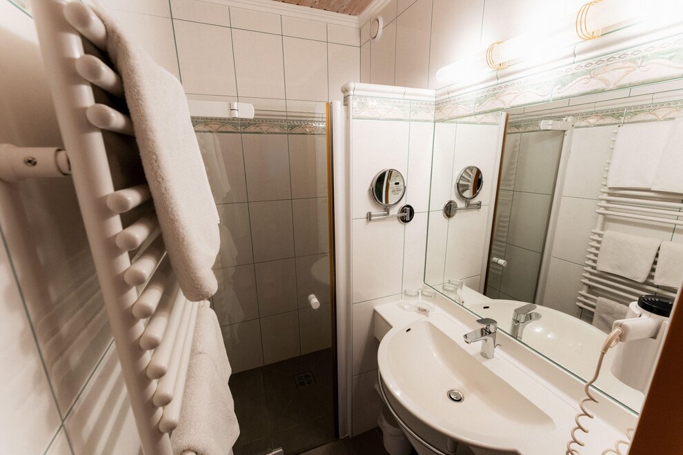 Allergenfreie Zimmer, mit Holzböden, ca. 30m². Gemütliche Sitzecke mit Minibar, Safe, Smart-TV - 42 Zoll Full HD Flatscreen,WLAN im ganzen Haus. Bademäntel und Badeschlappen am Zimmer, Dusche und Toilette getrennt. Alle Zimmer mit Balkon und Panorama - Bergblick.