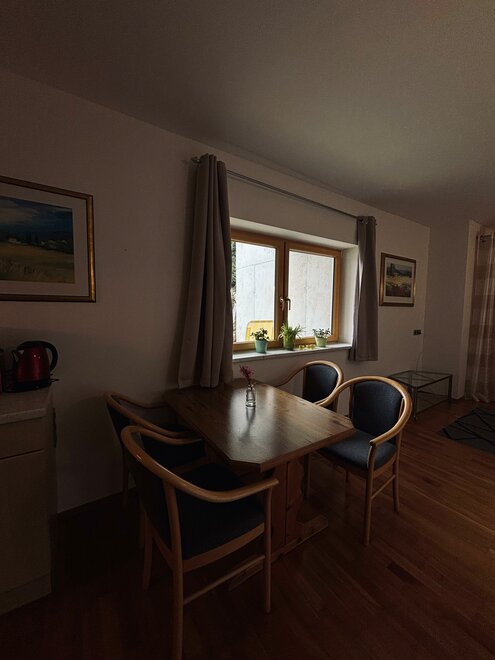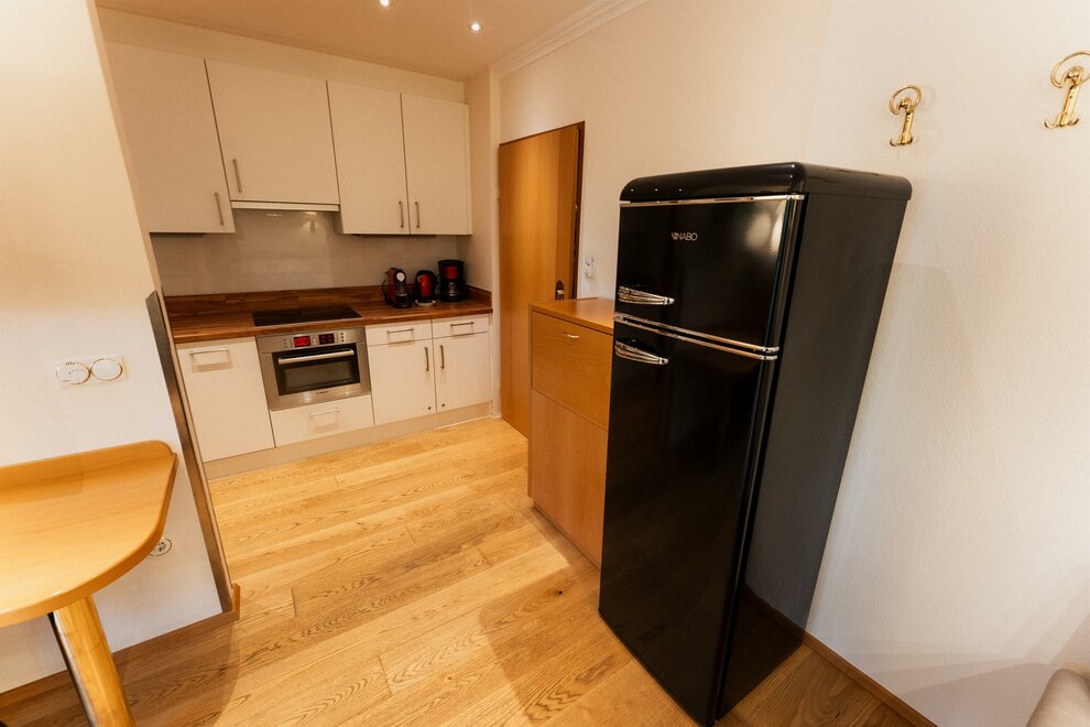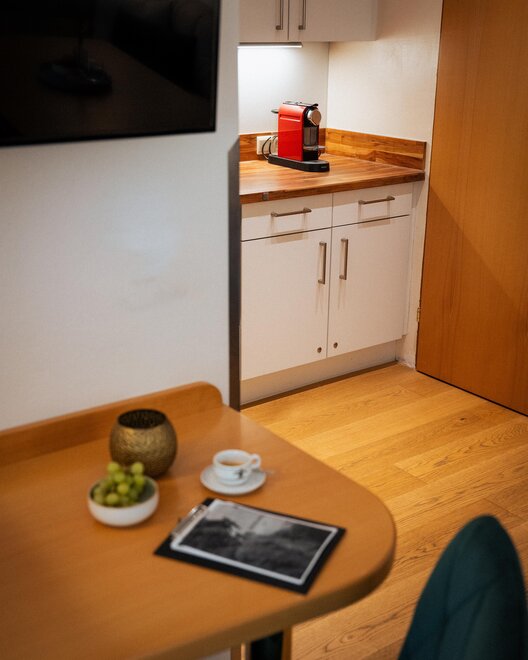 Dieses Studio befindet sich im Nebengebäude circa 50 Meter vom Hotelgebäude entfernt und ist ebenerdig begehbar und bietet allergenfreie Ausstattung mit Holzböden und eine voll ausgestattete Küche mit Kochfeldern, einem Kühlschrank, einem Geschirrspüler und einer Espressomaschine. SMART-TV, WLAN, Badezimmer mit WC, Bademäntel, Badeschlappen, Handtücher.