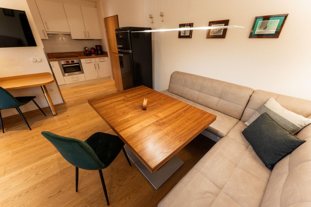 Allergenfreie Apartements, mit Holzböden, 2 Schlafzimmer, 1 Studio mit hochwertig eingerichteter Küche (Kühl-Gefrierschrank, Filterkaffee -und Espressomaschine, Mikrowelle und Backrohr, Induktionskochfeld, Geschirrspüler, Wasserkocher ), 3 x Dusche/WC, Bademäntel, Hand- und Badetücher. 3 x 42" SMART-TV, W-Lan und Lan, Balkone mit wunderschönem Rundumblick auf die Bergwelt der Dachstein-Tauern. Frühstück und tägliche Reinigung inklusive.