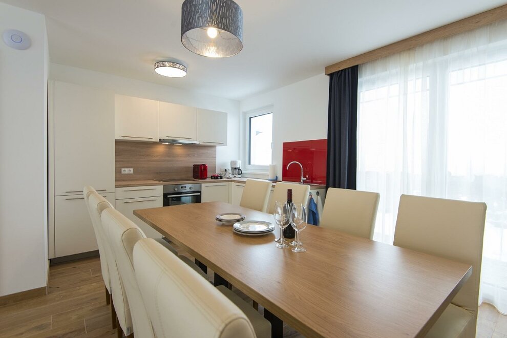Kochnische, Wohnzimmer, Wohnküche, Elektroherd, Backofen, Sitzgruppe, Geschirr vorhanden, Balkon (teilweise), WiFi, Küchenzeile, Kochmöglichkeiten, Kabelfernsehen, Tisch- und Küchenwäsche, Kühlschrank, Kaffee-Maschine, Geschirrspülmaschine, Haustiere nicht erlaubt, Fernseher, Küche, Dunstabzug, Esszimmer