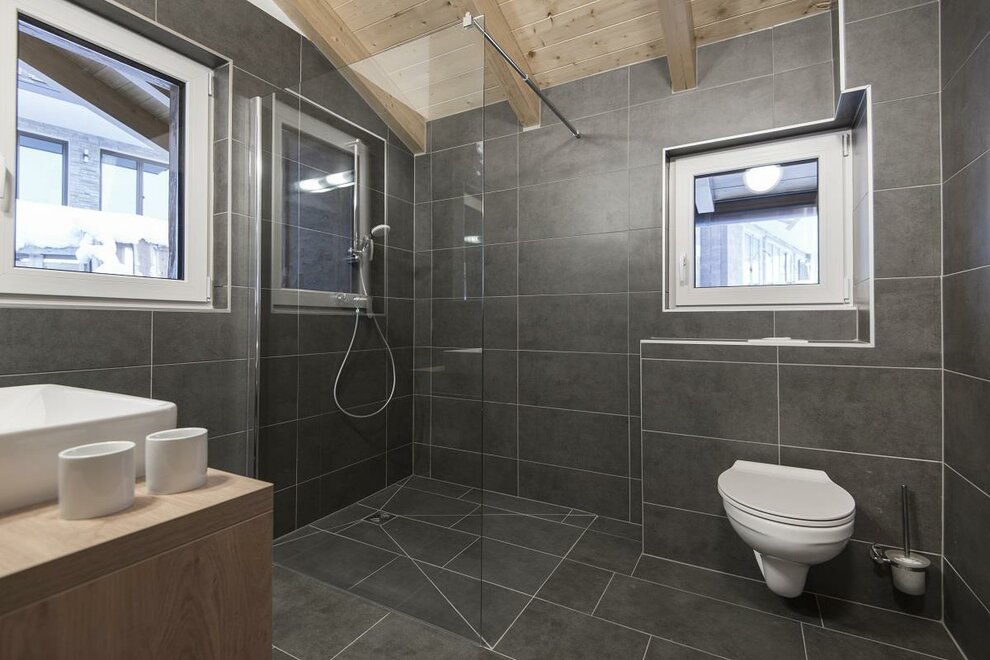 Dieses Chalet verfügt über 4 Schlafzimmer, 3 Badezimmer wobei eines eine Infrarotkabine besitzt. Große Wohnküche mit Zugang zu den beiden Terrassen.
