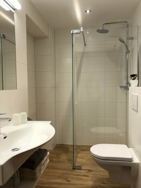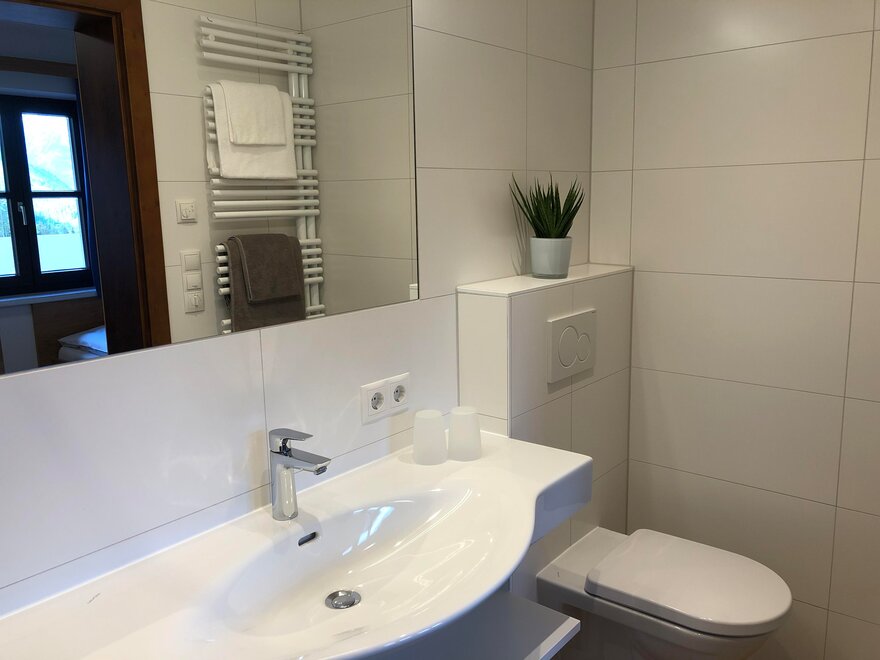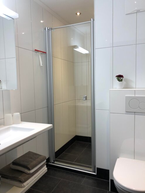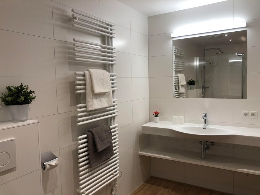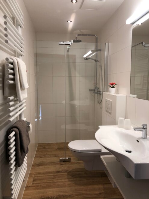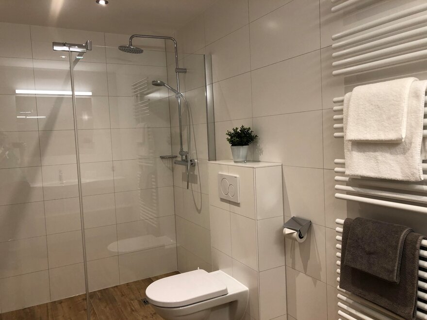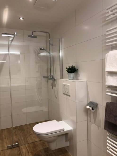 2 Badezimmer mit Dusche, WC, Fön und Handtuchtrockner