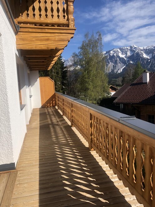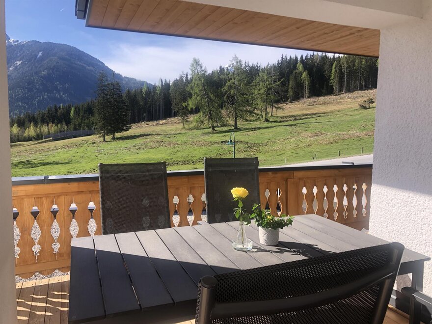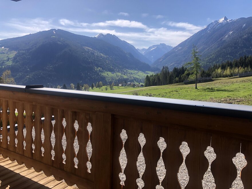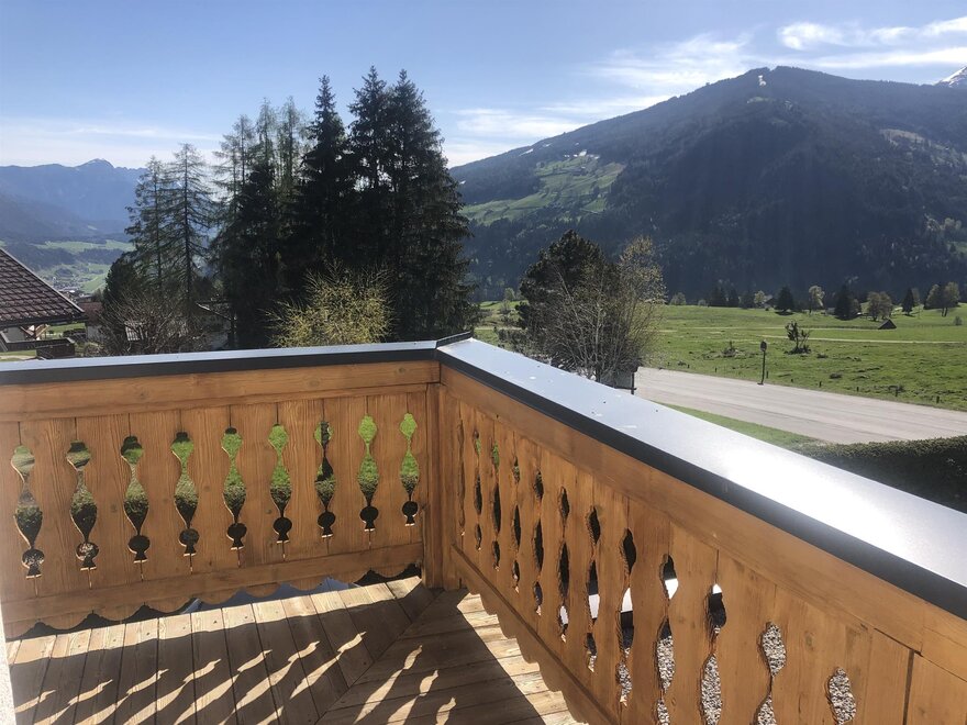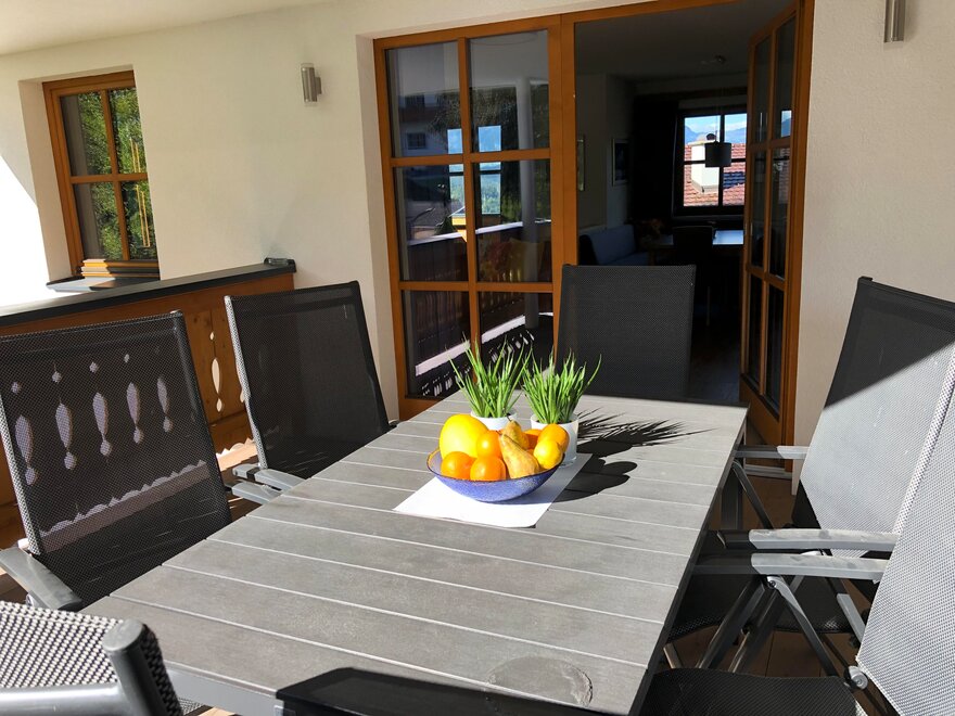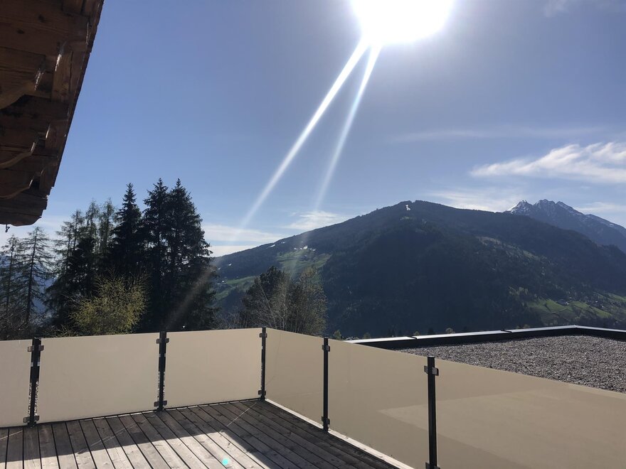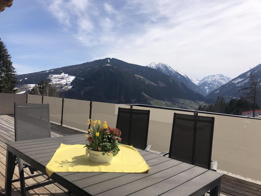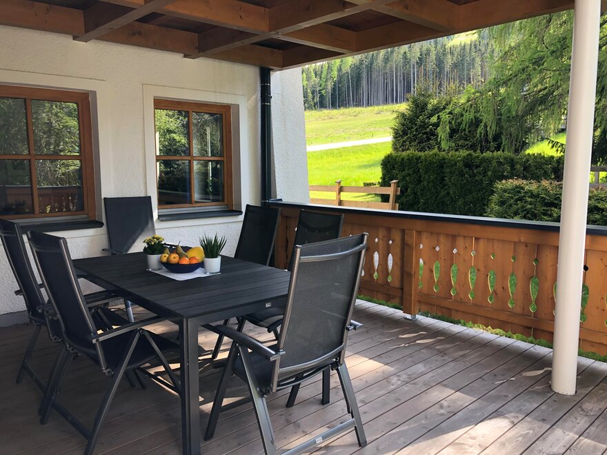 große, überdachte Terrasse und Balkon mit Blick auf die umliegende Bergwelt und unsere Seitentäler