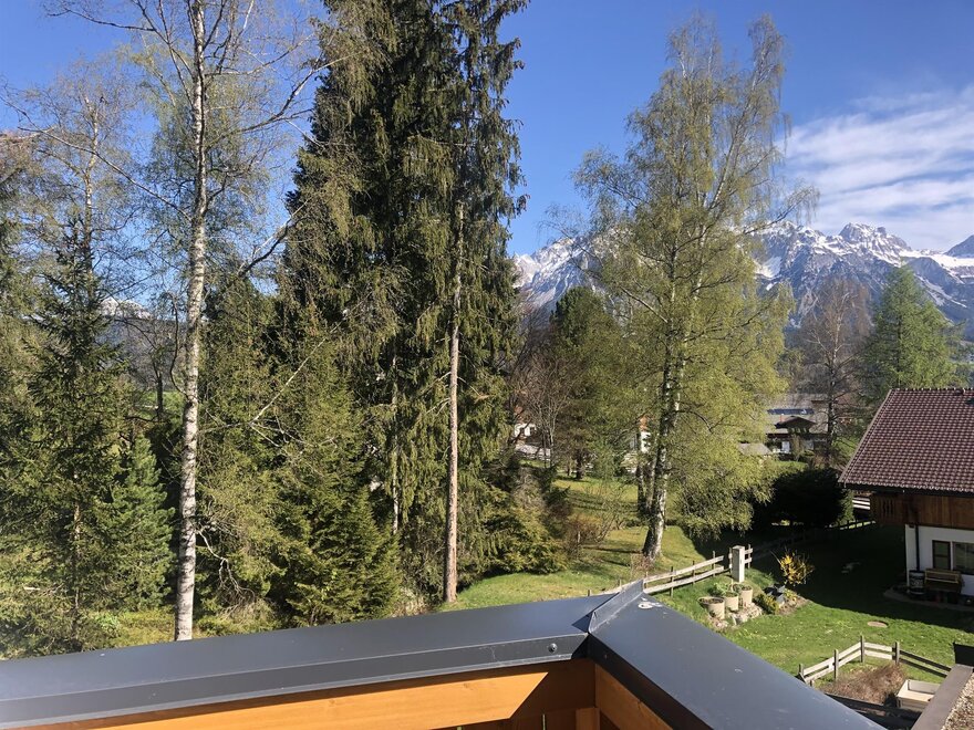 großzügige Terrasse mit Blick in den Garten und auf die Hochwurzen & das Dachsteinmassiv
