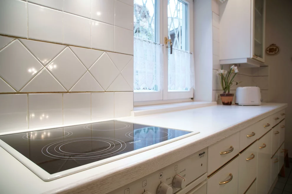 Voll ausgestatte Küchenzeile mit Geschirrspüler, Herd, Backrohr, und Kühlschrank.