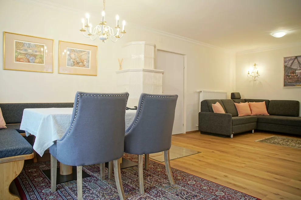 Gemütliches Wohn- und Esszimmer mit Schlafsofa und Kachelofen.