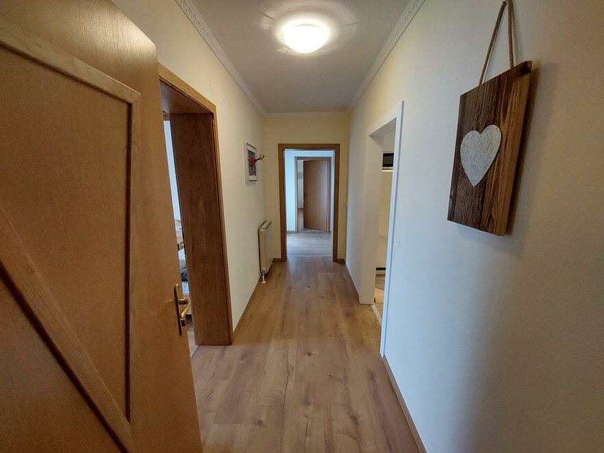 Appartement für bis 6 Personen (74m2) mit 3 Schlafzimmern: 3x DZ, je mit Kabel-TV, 2x DU/WC und Südbalkon. Wohnraum mit Flat-TV und komplett eingerichteter Küchenzeile mit Geschirrspüler, E-Herd mit Ceranfeld, Backrohr, Mikrowelle, Kaffeemaschine, Wasserkocher und Toaster. Vorraum mit Garderobe. Küchen-, Handtücher, Bettwäsche, Haarföhn, gratis W-LAN sowie Händedesinfektionsspender. Ski-und Schuhraum. Sauna/Infrarot im Haus (gegen Gebühr)
