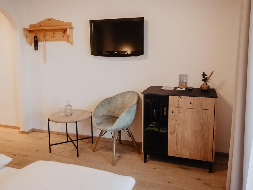Holzboden, hochwertiges Doppelbett, Tisch mit Couchsessel, Badezimmer mit Dusche/WC, Balkon in Südlage, Minibar, vegane Pflegeprodukte (Das Doppelzimmer Classic befindet sich im Vis-á-Vis-Gebäude, das unterirdisch mit dem Haupttrakt verbunden ist.)