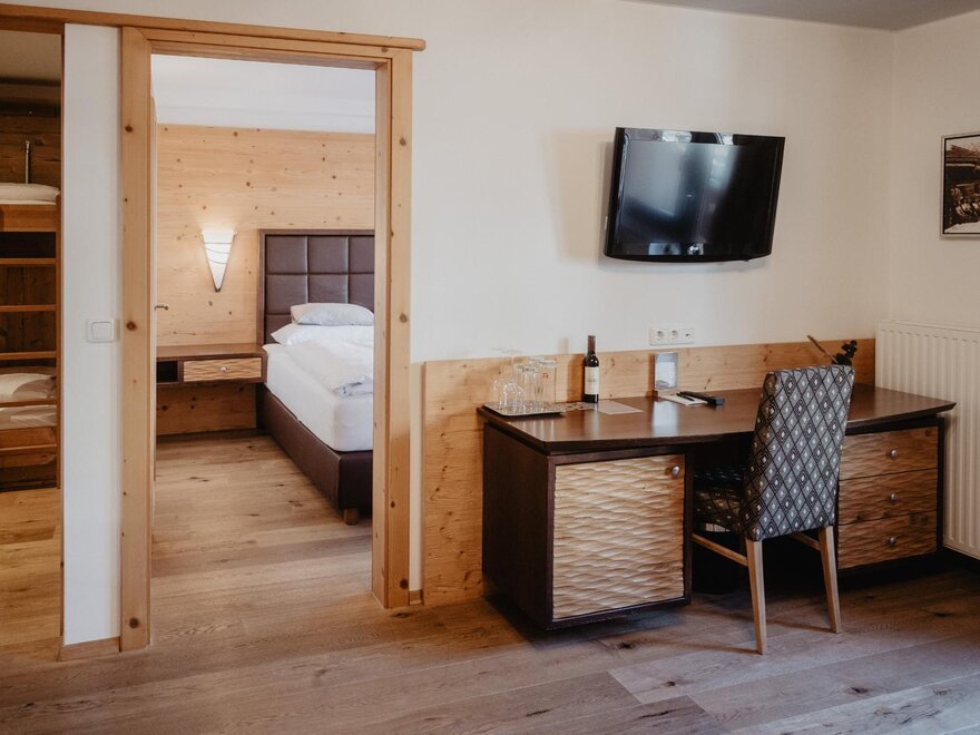 Boxspringbett, Kinderzimmer mit Stockbett, Wohnzimmer (mit doppelter ausziehbarer Schlafcouch), Badezimmer mit Badewanne oder Dusche, WC, Balkon (Diese Suite befindet sich im Vis-á-Vis-Gebäude, das unterirdisch mit dem Haupttrakt verbunden ist.)