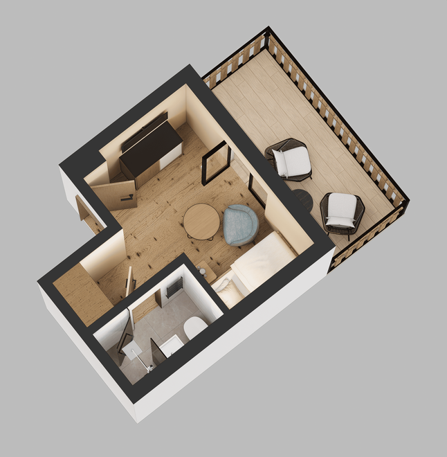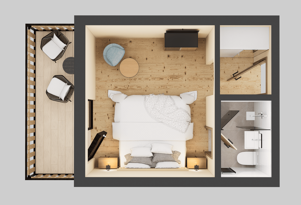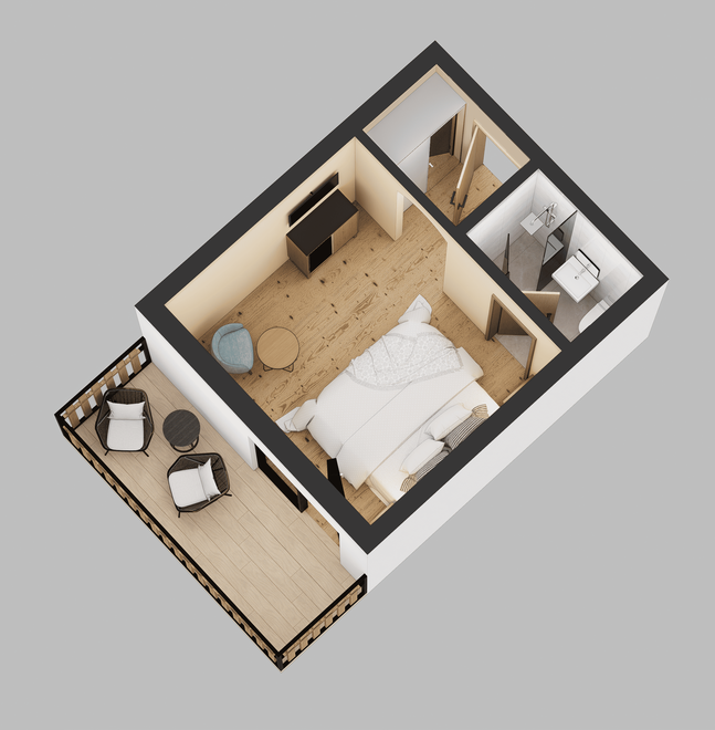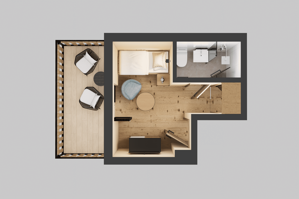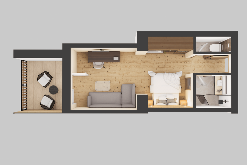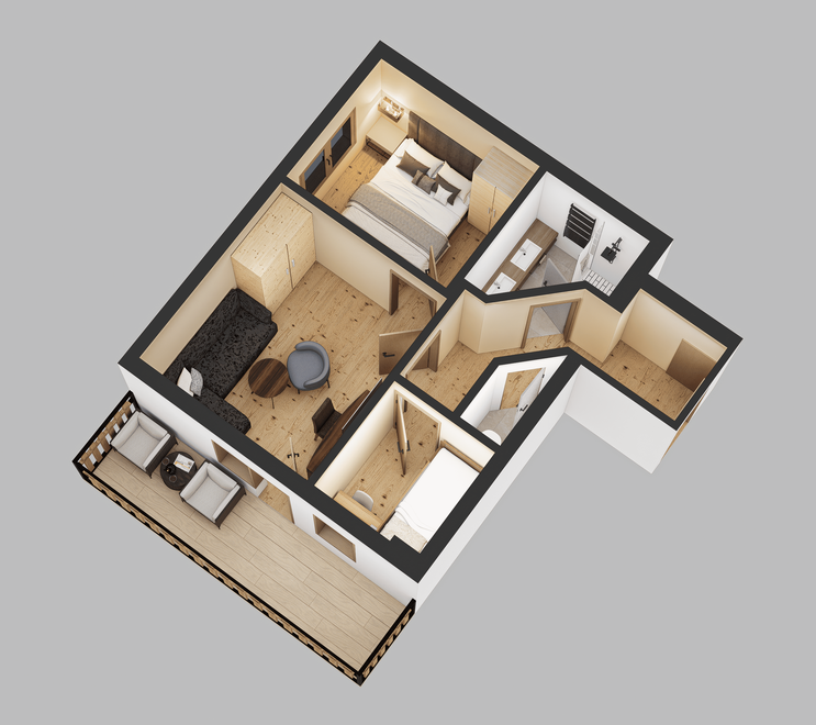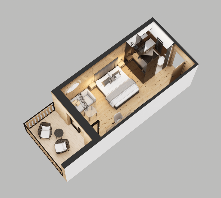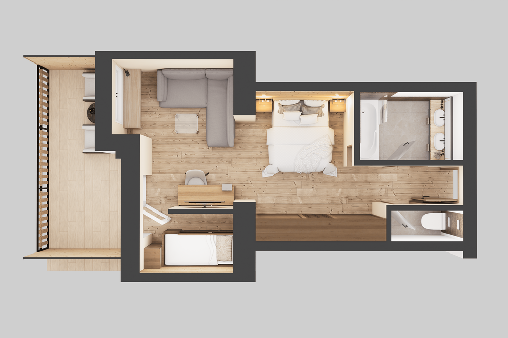 Holzboden, Boxspringbett, Schreibtisch und Couchbereich, Badezimmer mit Dusche/WC, großzügige Loggia in Nord-,Ost-, oder Westlage, Minibar, TV, Safe, Föhn, Kosmetikspiegel, vegane Pflegeprodukte, Wellnesstasche inklusive Bademantel & Slipper