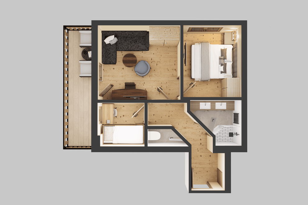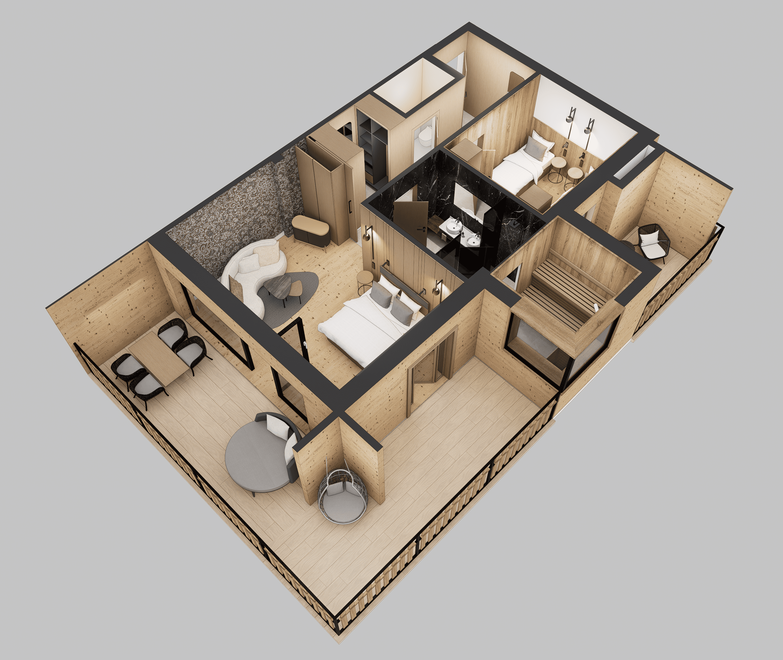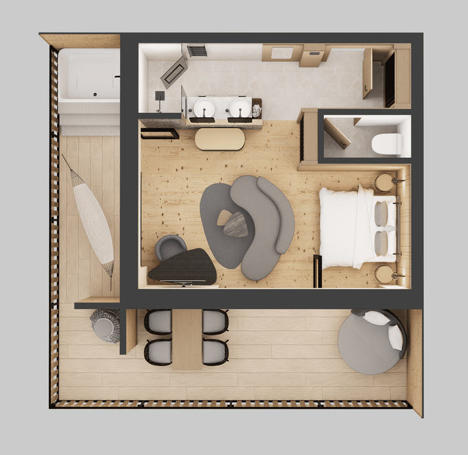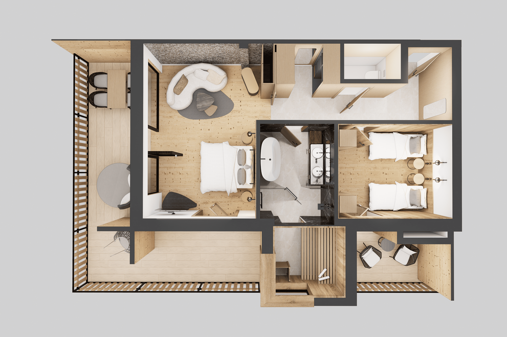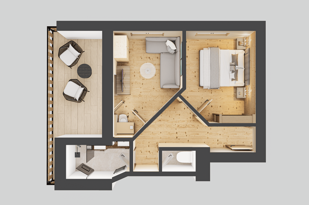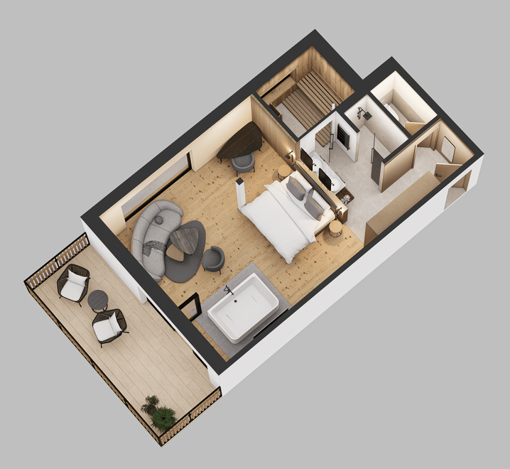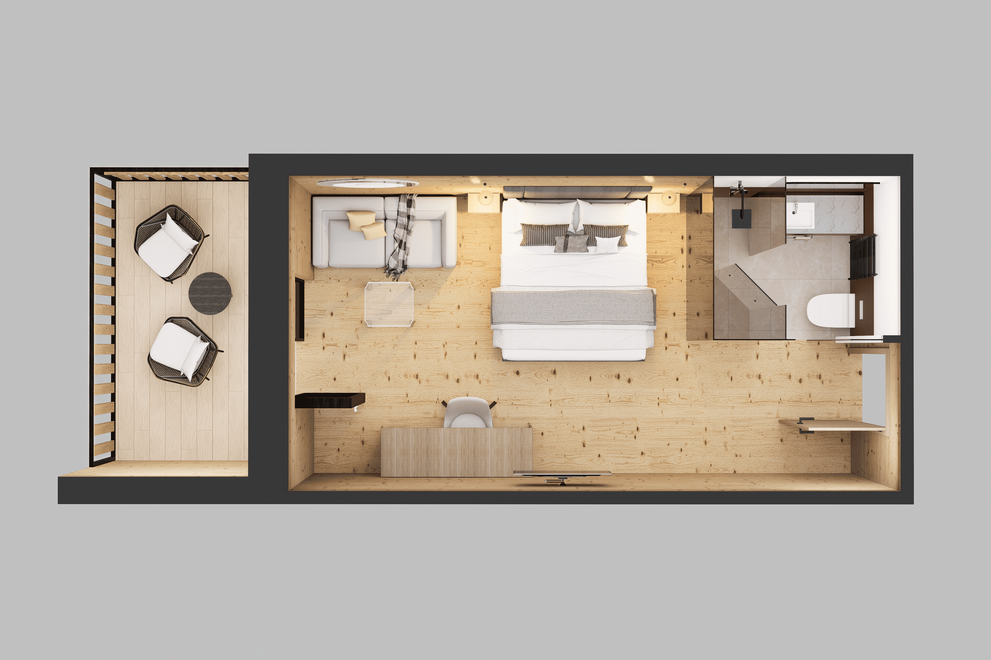 Holzboden, Boxspringbett, Schreibtisch und Couchbereich, Badezimmer mit Dusche/WC, großzügige Loggia in Nord-,Ost-, oder Westlage, Minibar, TV, Safe, Föhn, Kosmetikspiegel, vegane Pflegeprodukte, Wellnesstasche inklusive Bademantel & Slipper