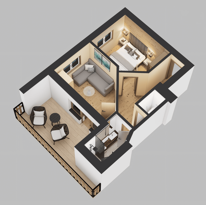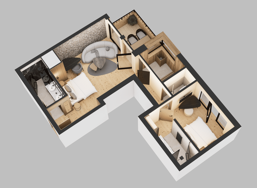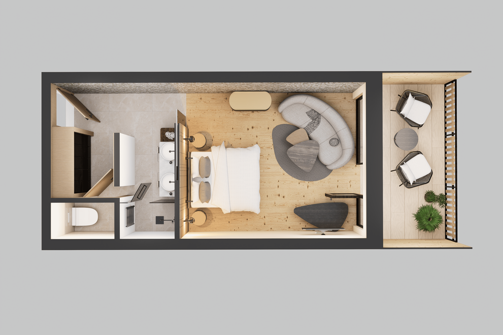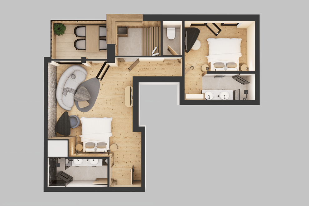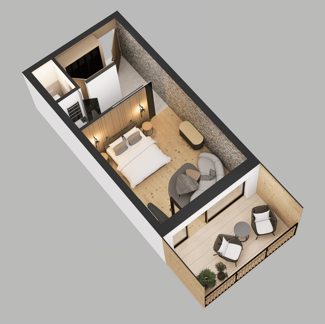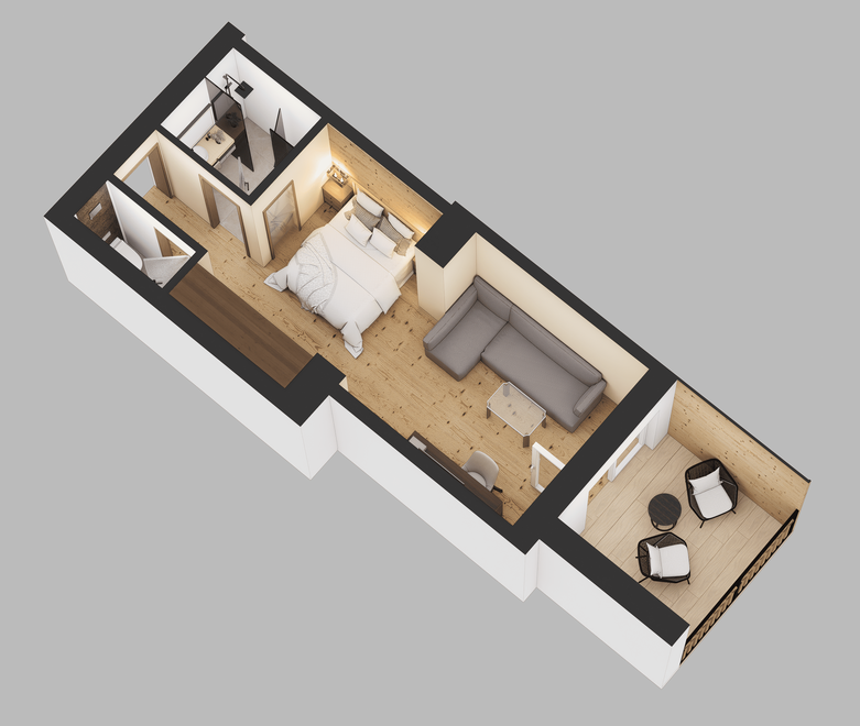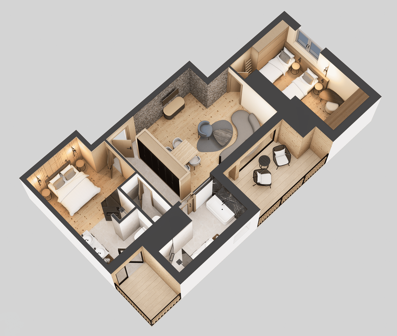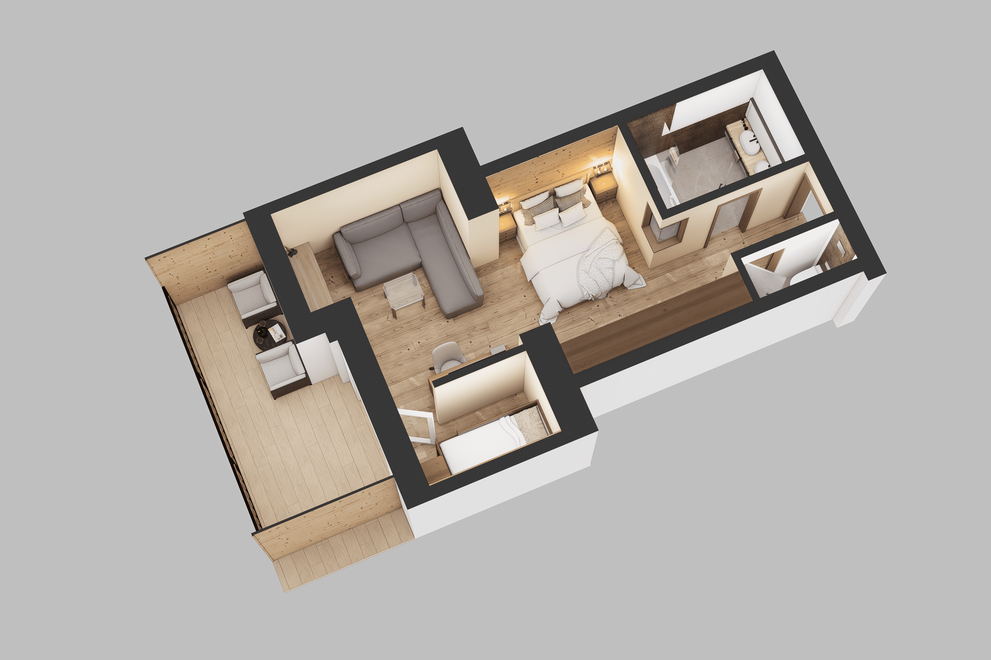 Holzboden, Boxspringbett, Schreibtisch und Couchbereich, Badezimmer mit Dusche/WC, großzügige Loggia in Nord-,Ost-, oder Westlage, Minibar, TV, Safe, Föhn, Kosmetikspiegel, vegane Pflegeprodukte, Wellnesstasche inklusive Bademantel & Slipper