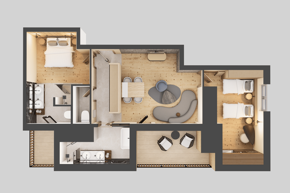 Klimaanlage, großes Panoramafenster, Holzboden, Boxspringbett im Elternschlafzimmer, eigenes Kinderzimmer für bis zu 3 Kinder, Schreibtisch & Couchbereich, Badezimmer mit Dusche & Badewanne, WC, großzügige 40 m² Loggia mit privater Outdoor Sauna