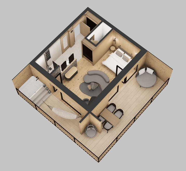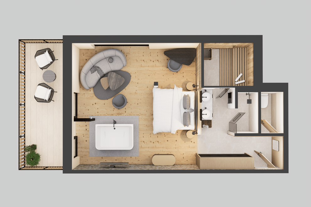 Klimaanlage, großes Panoramafenster, Holzboden, Boxpringbett, Schreibtisch & Couchbereich, freistehende Doppelbadewanne im Wohnbereich, offenes Badezimmer mit Dusche, separates WC, großzügige Loggia mit privater Outdoor Sauna, Kaffeemaschine