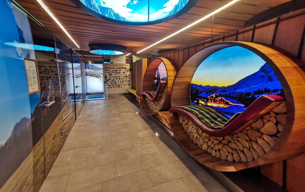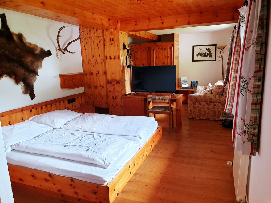 Eingerichtet mit einer gemütlichen Sitzecke und Schreibtisch. Alles ist mit Zirbenholz möbiliert.Betten Verteilung