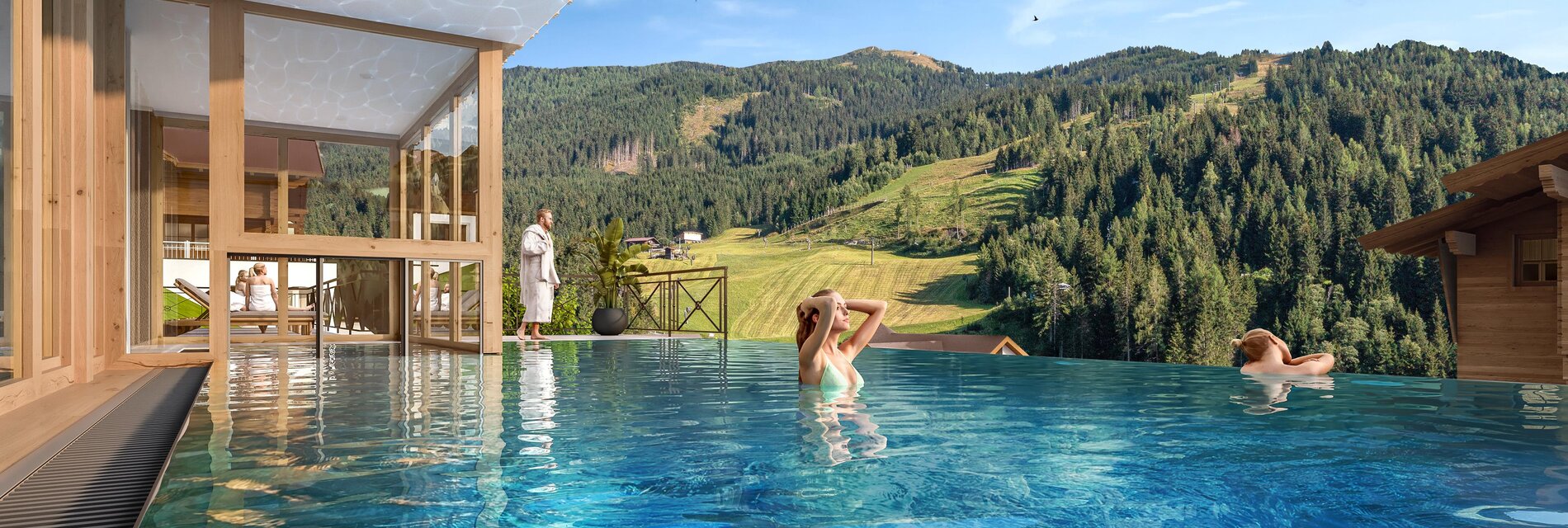 Am Hang hinter unserem „Stammhaus“ steht nun ein ganz neues Haus im Charme des Traditionellen. Es entstanden 16 neue, große Panoramazimmer allesamt mit bestem Blick ins Tal und in die umliegende Bergkulisse des Gasteinertals. Dazu ein kleiner feiner Wellnessbereich mit Ruheraum, 2 Saunen und einem schönen Fitnessraum – wenn das Wetter mal nicht so mitspielt, oder man den antrainierten Urlaubspfunden gleich den Kampf ansagen will. Das i-Tüpfelchen ist der ganzjährig beheizte Außenpool mit Inneneinstieg und einer Liegefläche im Außenbereich. Erreichbar ist die Bergseit’n über eine gläserene Allwetter-Panorama-Brücke zum „Stammhaus“.