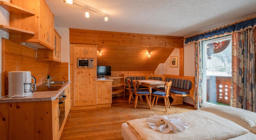 Mit Küchenblock (2 Herdplatten, Kühlschrank mit Gefrierfach, Spüle, Geschirr, Filterkaffeemaschine, Wasserkocher), Esstisch mit Sitzbank und 2 Stühlen, Flatscreen-TV / gratis Wlan und Balkon!Ausstattung Zimmer/Appartement