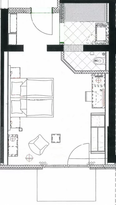 Doppelbett bzw. teilweise Grand-lit (1,4 x 2 m) Dusche/WC, Schreibtisch, Couchsessel & Tisch, KühlschrankAusstattung Zimmer/Appartement