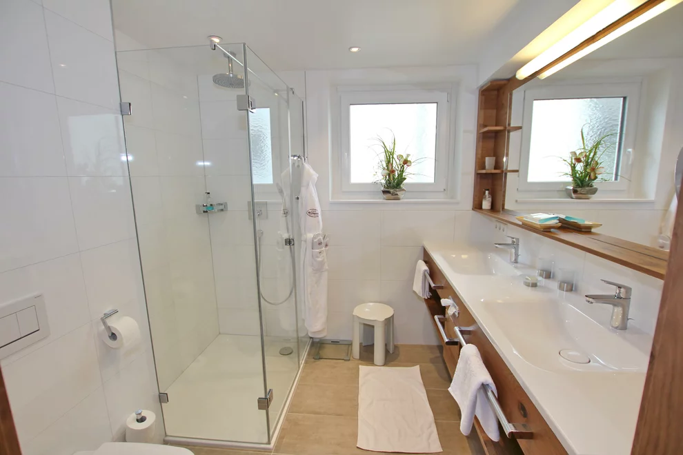 exklusives Badezimmer mit Badewanne, Doppelwaschtisch & Dusche. WC separat,Ausstattung Zimmer/Appartement