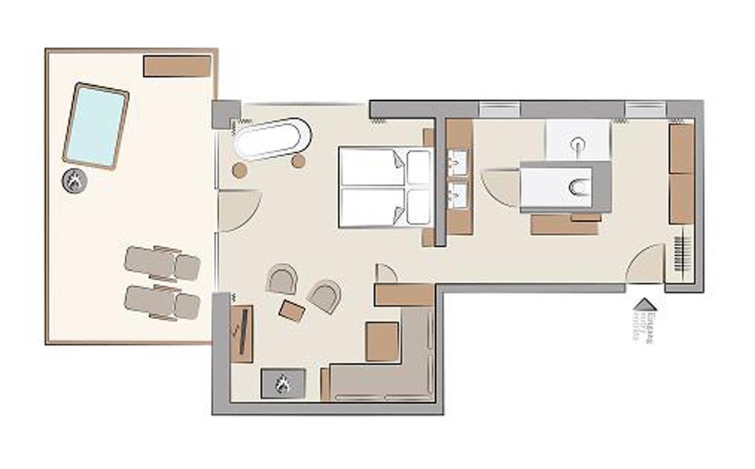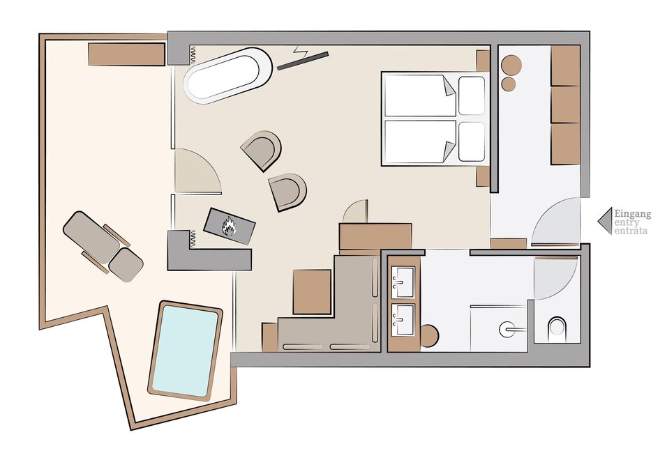Der großzügige Wohn- und Schlafbereich mit Sitzecke und offenem Kamin lädt zum Verweilen ein. Als Design-Highlight: die freistehende Badewanne mit Panoramablick. Und als Rückzugsort: die südseitige Dachterrasse. Das Pendant dazu im Bad: die Regendusche. Design trifft Mutter Natur. Mit geölten Holzböden, Naturmaterialien wie Wolle und Leder, Wandverzierungen mit Blattgold und altem Stadlholz. NEU: mit Hot Tube im Freien.