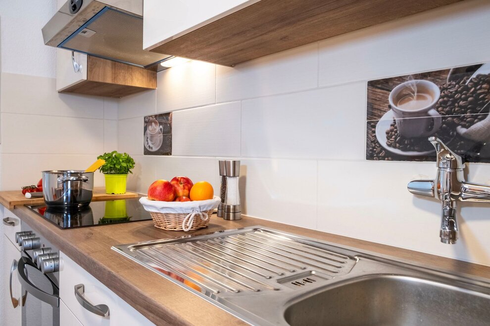 Die Ferienwohnung bietet ein Schlafzimmer mit einem Kingsize-Doppelbett, eine komplett ausgestattete Küche mit allen nötigen Kochutensilien (inkl. Mikrowelle, Backofen, Wasserkocher, Geschirrspüler, Kaffeemaschine), sowie ein eigenes Badezimmer mit einer Duschkabine, Handtuchtrockner und Föhn.