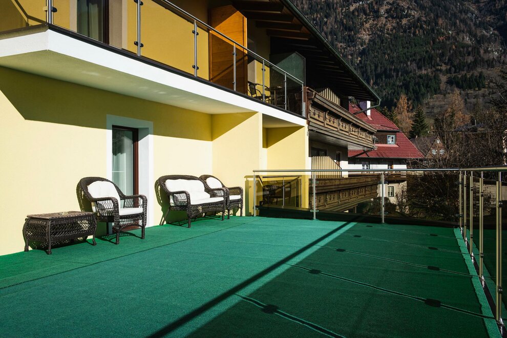 Das Highlight dieser Unterkunft ist eine 50m2 große Terrasse mit gemütlicher Sitzgarnitur und herrlichem Blick auf die Gasteiner Bergwelt.