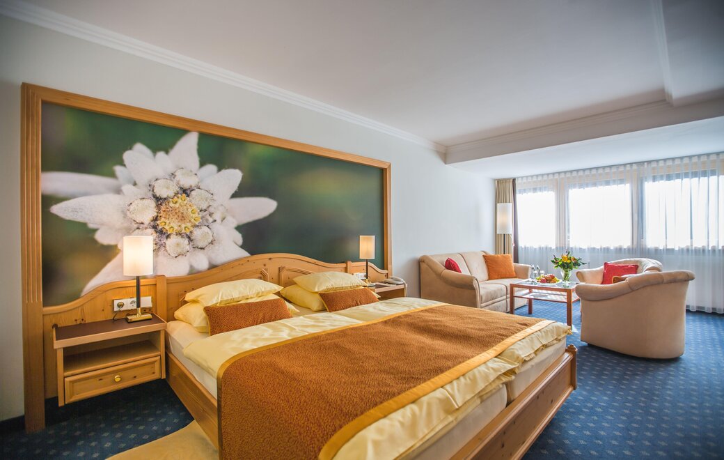 Geräumiges Eck-Zimmer mit Balkon und Blick auf das herrliche Gasteiner Bergpanorama. Ausgestattet mit großem Doppelbett (180 x 210 cm), gemütlicher Sitzgelegenheit, Radio, Kabel-TV, Telefon, kostenlosem WLAN, Teestation mit Wasserkocher, Minibar (Bestückung auf Anfrage) und Zimmersafe.