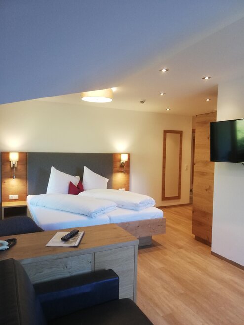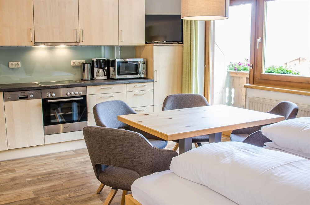 Das Panorama-Appartement besteht aus einem Schlafzimmer mit 2x Dusche + WC und einer separaten voll ausgestatteten Wohnküche.