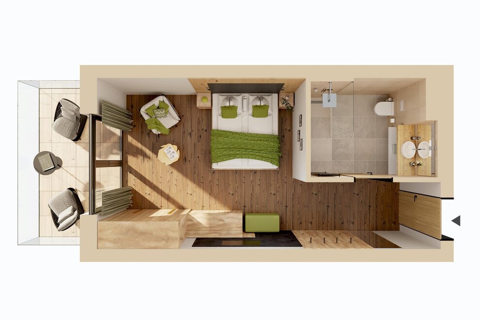 Unser Klassiker bietet alles was Sie brauchen: Mit einer Zimmergröße von 25 m², einem Wohn- & Schlafbereich mit Doppelbett (TWIN möglich) sowie einer gemütlichen Sitzecke.