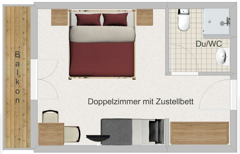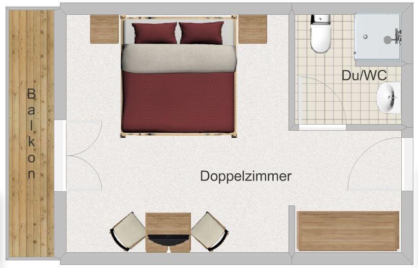 Doppelzimmer sind ausgestattet mit Dusche und WC, Balkon, Kabel-TV, Telefon, kostenloses W-Lan