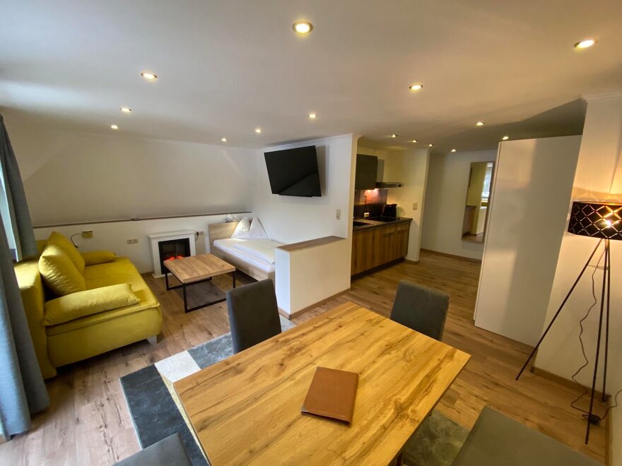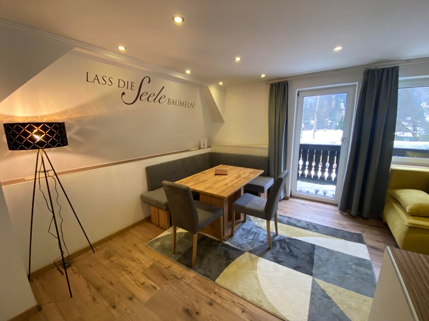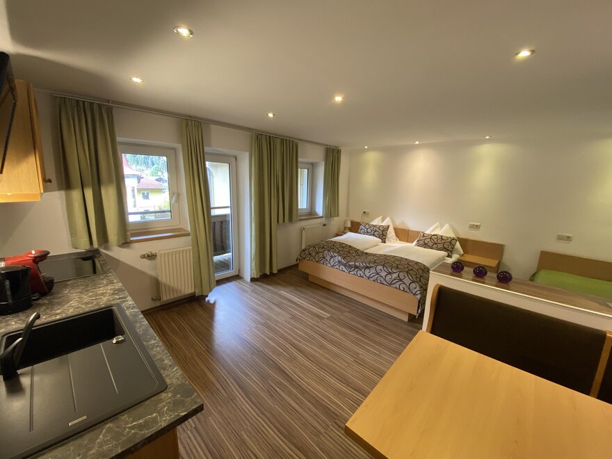 Studio "Alpine Modern: Tauchen Sie ein in die Welt des alpinen modernen Designs und lassen Sie sich von den frischen Farben inspirieren. Unser Studio bietet Ihnen ein komfortables Bad mit Dusche und WC sowie eine gemütliche Sitzecke und eine praktische Miniküche. Buchen Sie jetzt und erleben Sie einen einzigartigen Aufenthalt mit Komfort und Stil.