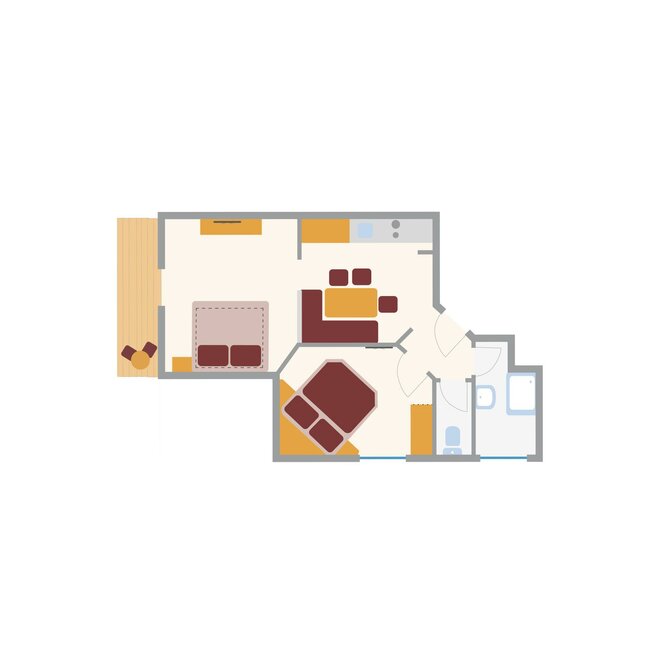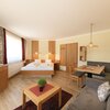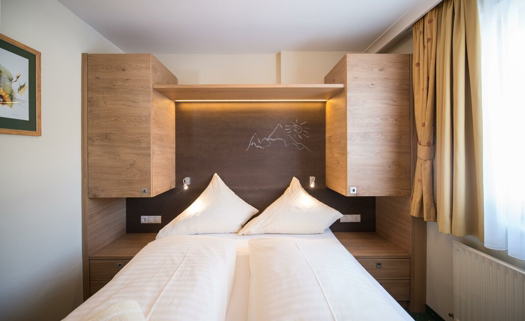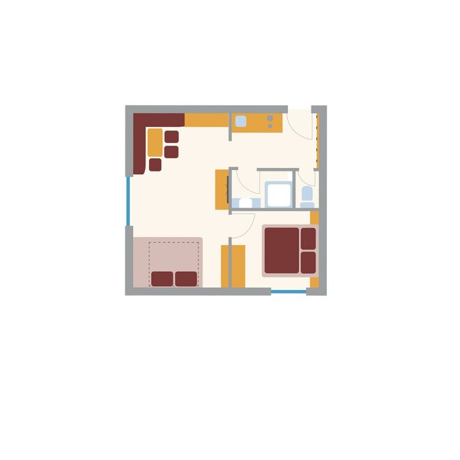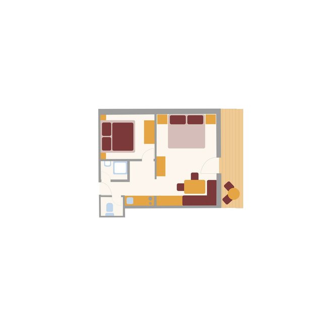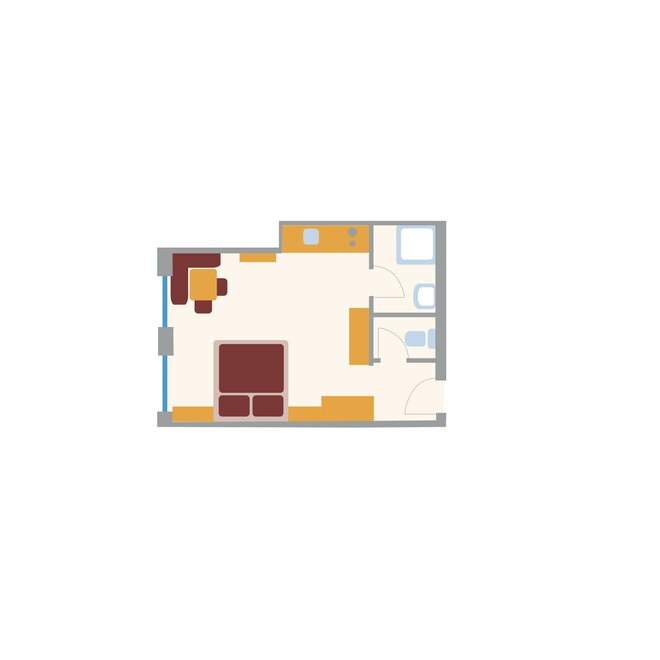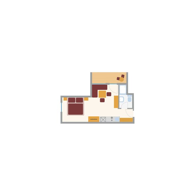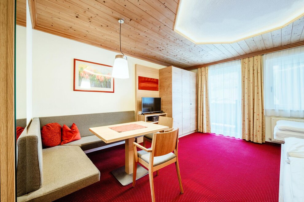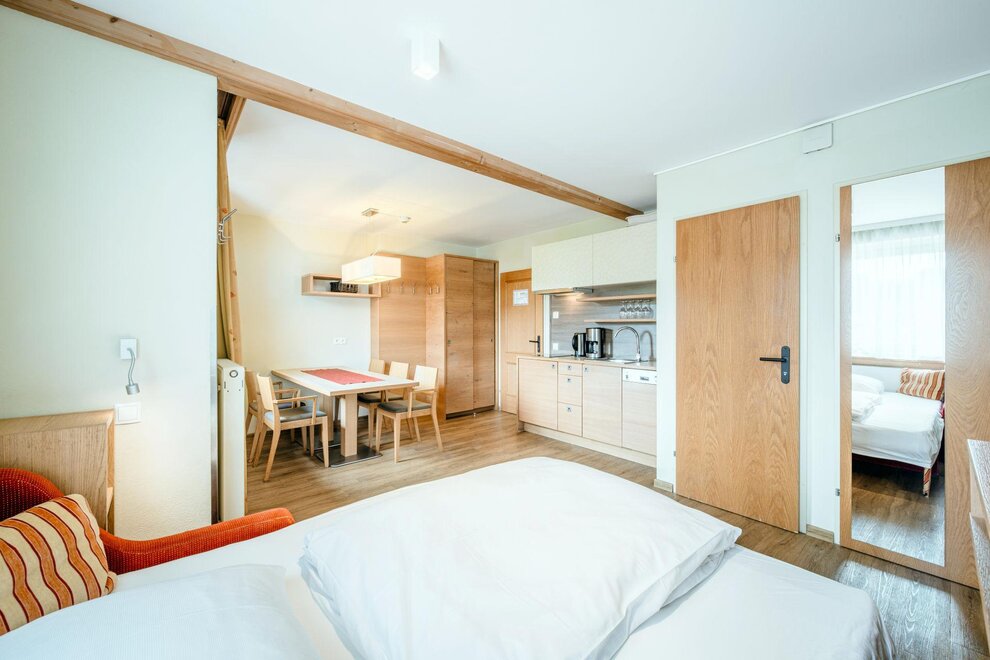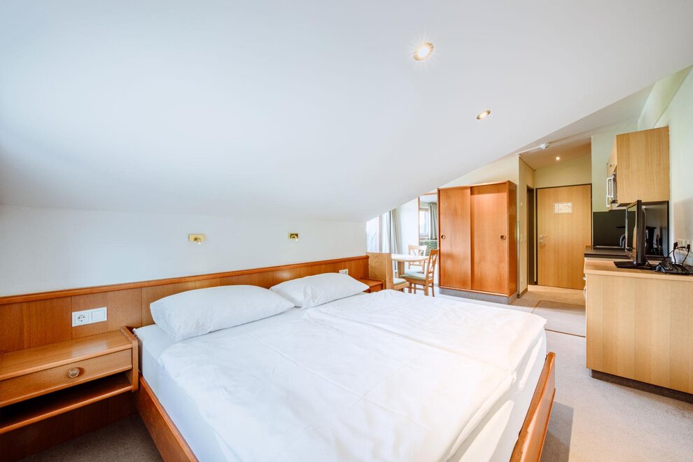 Wohnen bis 2 Personen. Einzimmerappartement mit kleinem Vorraum, Wohn-/Schlafraum mit Doppelbett, Ferienkochnische, Dusche, WC, Balkon, Safe, Fön, Kabel-TV, Radio und Telefon. Teilweise mit Ecksitzbank ausgestattet.