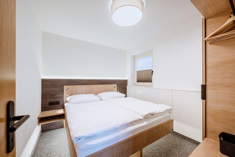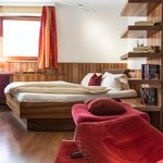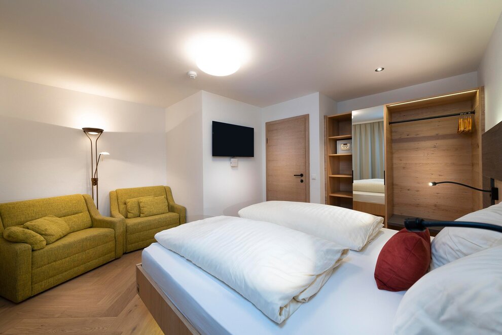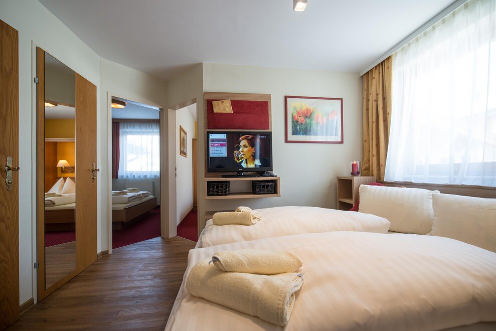 Platz bis 6 Personen. Zweiraumappartement mit Vorraum inkl. Kochnische, Dusche, WC, Wohn-/Schlafraum mit Doppelbett und Couch für 2 Personen, ein Schlafzimmer mit Doppelbett, Balkon, Safe, Fön, 2x Kabel-TV, Telefon.
