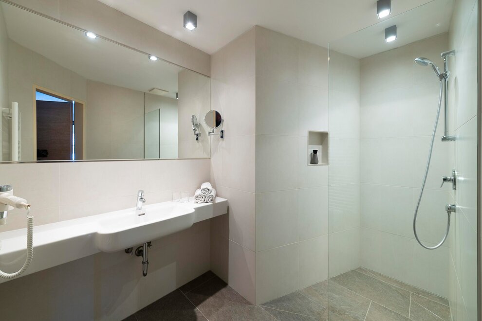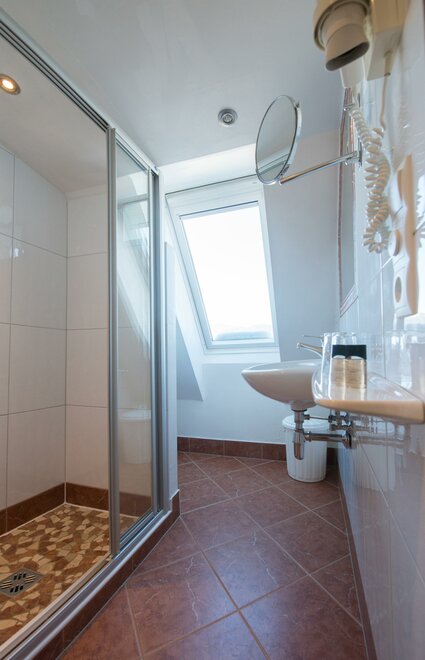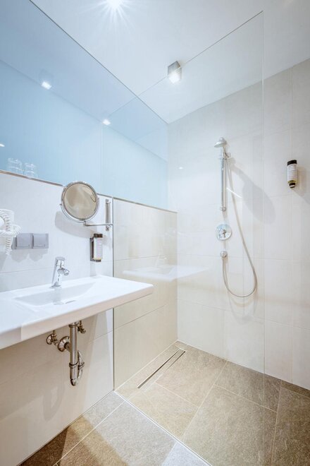 Ein cozy Schlafzimmer mit Dusche / WC, Föhn, Radio, großer Flat-TV, im Souterrain, ohne Balkon, mit Blick auf den Garten, zum Lift.