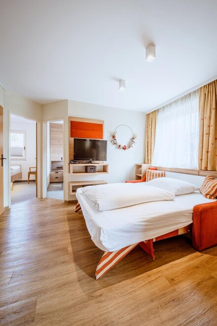 Gemütlichkeit bis 4 Personen. Zweiraumappartement mit Vorraum inkl. Kochnische, Dusche, WC, Wohn-/Schlafraum mit Doppel-Schlafsofa, Schlafzimmer mit Doppelbett (150 cm), Balkon, Safe, Fön, 2 x Kabel-TV, Telefon.