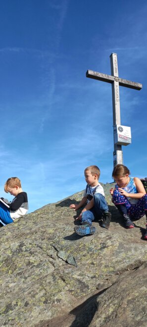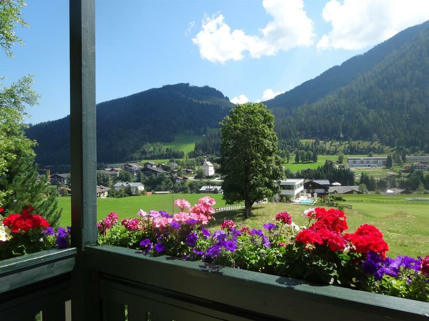 Apartment small hat Schlafzimmer, Wohnschlafzimmer, Küche, Dusche, WC, Balkon, 46m2. Balkon nach Osten mit Blick zur Kirche und auf die Berge.