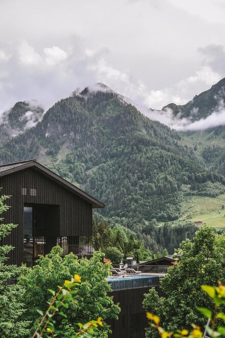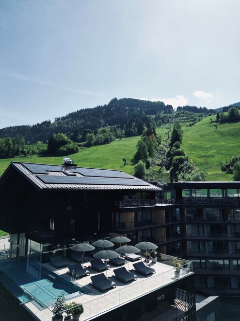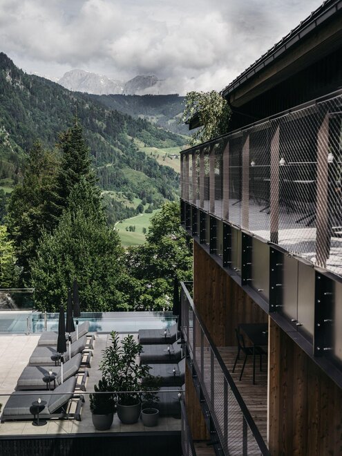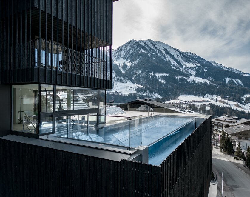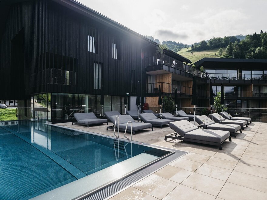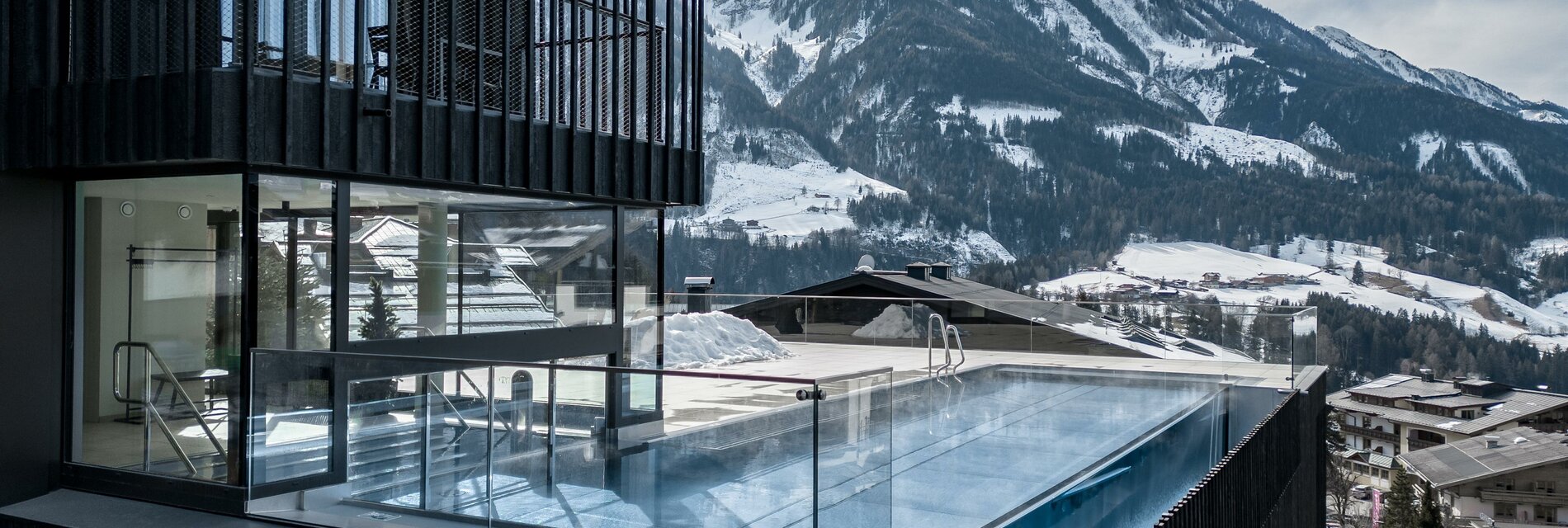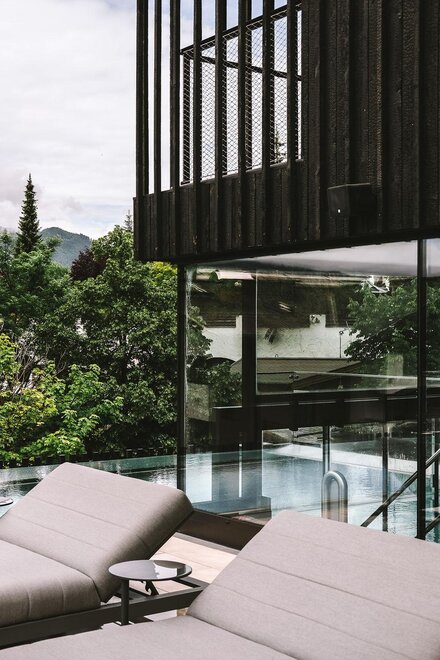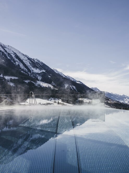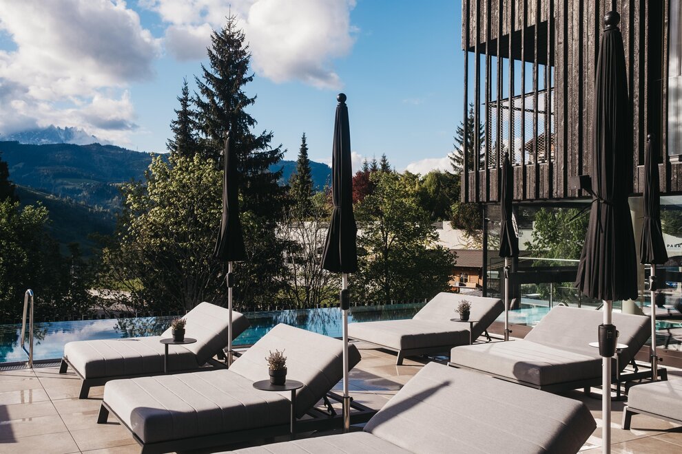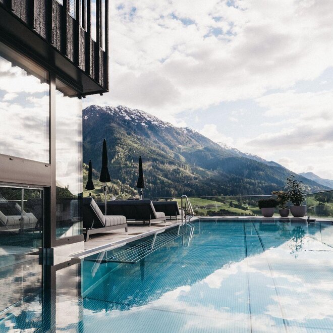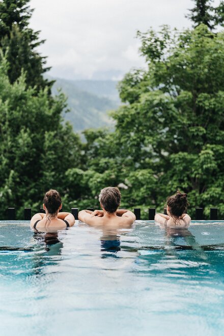 ganzjährig beheizter Infinity-Pool für groß und klein mit Liegeterrasse im Sommer
