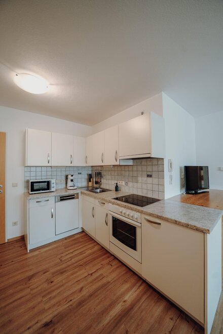 komplett ausgestattete Küche (Mikrowelle, Elektroherd mit Backrohr, Kaffeemaschine, Geschirrspüler),