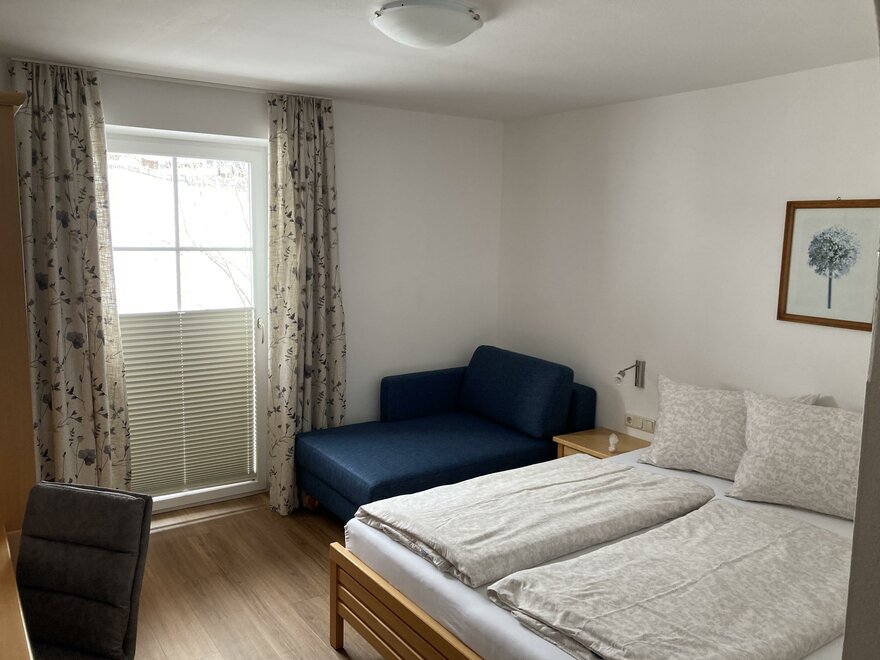 Südseitig gelegenes Doppelzimmer mit Schrankbett und ausziehbarer Couch. Tisch, Stühle, Minikühlschrank,