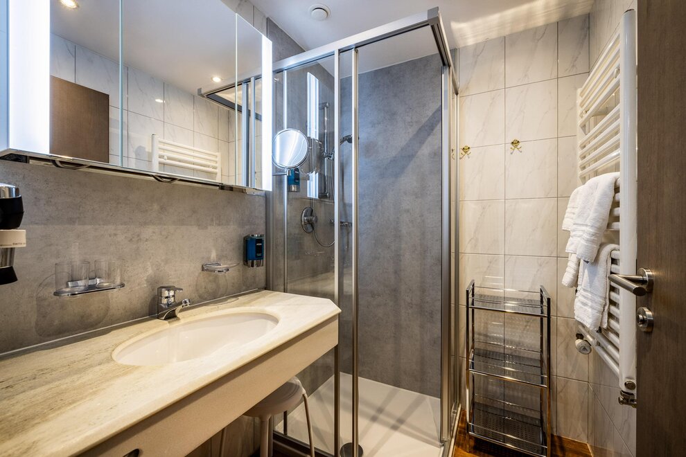 Badezimmer (ca. 1,80m x 1,60m), mit Dusche, Schminkplatz, Föhn