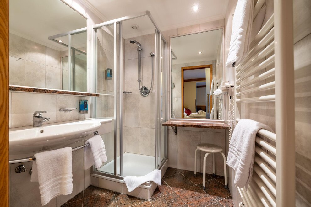 Badezimmer mit Dusche, Föhn