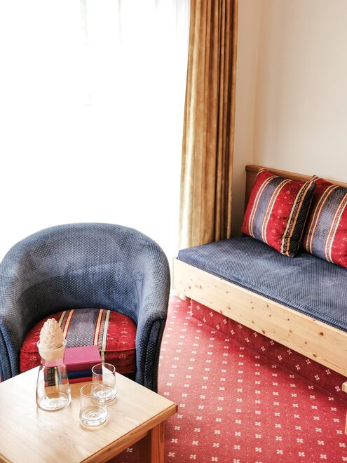 Mansarde mit Doppelbett . Couch (1 Pers) . Flat-Screen-Kabel-TV . Radio . Zimmersafe . W-Lan . teilw. Balkon . Bad mit Dusche . Toilette sep . Haarföhn . Kosmetikspiegel . TEEKÜCHE: 2er-Kochfeld . Mikrowelle . Kühlschrank . Tägl Reinigung inklusive