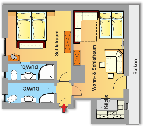 Ankommen und Wohlfühlen. Dieses große, voll ausgestattete Familienzimmer bzw. Appartement besteht aus einem Schlaf- und einem Wohnschlafzimmer (jeweils Doppelbetten) und und ermöglicht ein komfortables Wohnen für 2 - 6 Personen. Eine eigene Küche, sowie der nach Süden ausgerichtete Balkon sind die Grundlage für angenehmen Wohnkomfort. Zwei getrennte Dusch/WC-Einheiten ermöglichen auch mehreren Personen gemeinsames Wohnen ohne Einschränkungen.