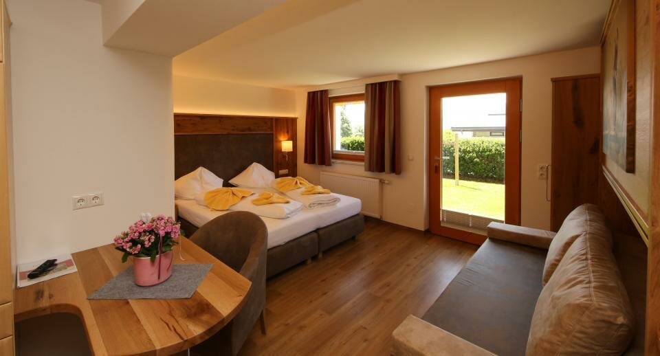 Das Zimmer hat eine nach Süden ausgerichtete großen Terrasse direkt in den Garten. Ideal zur Kombination mit Appartement 9 bei größeren Familien.Ausstattung Zimmer/Appartement